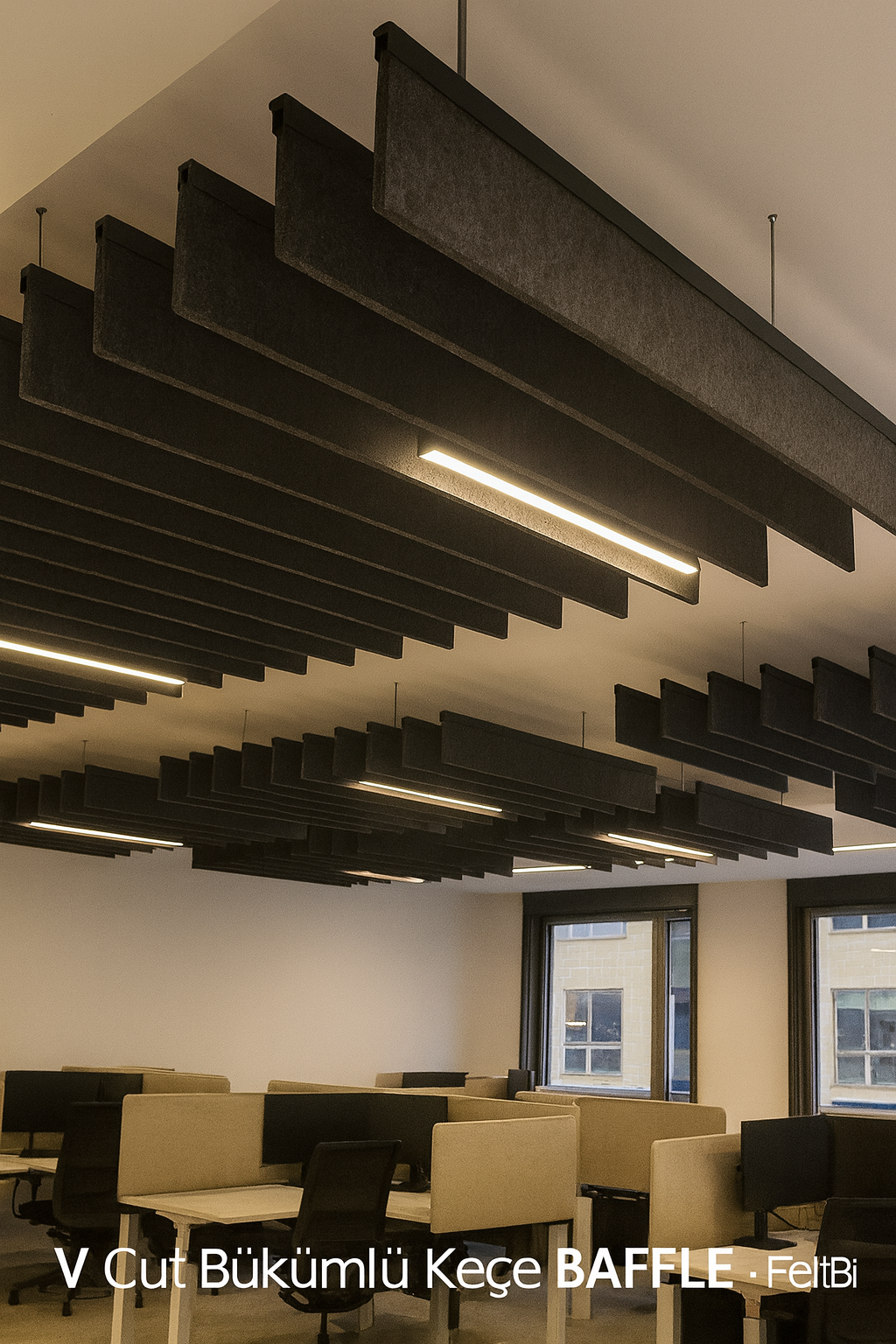 V-Cut Bükümlü Keçe Baffle Tavan Sistemleri – Modern Akustikte Esnek Çözüm | FeltBi