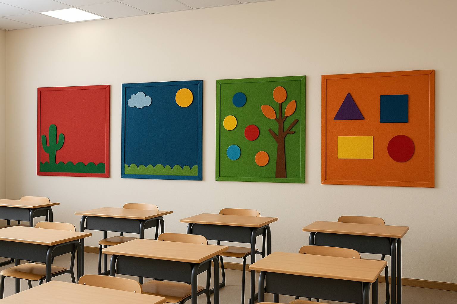 • FeltWall akustik paneller gibi keçe bazlı ürünler, sınıf duvarlarını hem estetik hem de sessiz hale getirir.