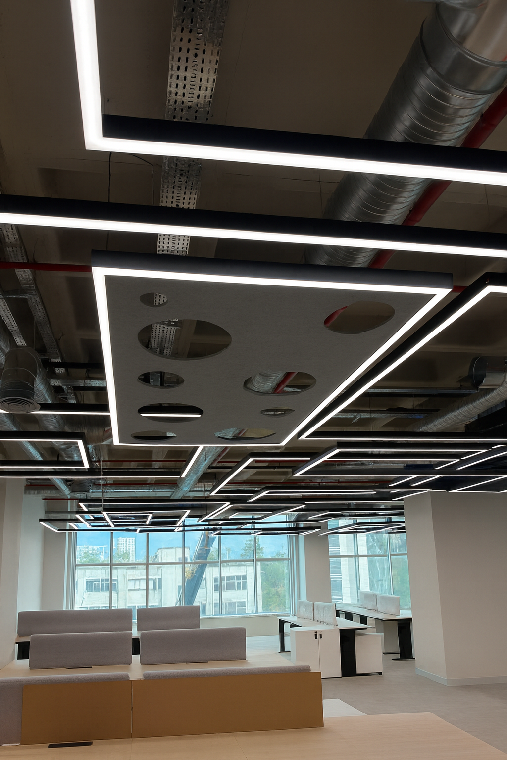 KP Aydınlatma, sadece akustik bir panel değil, aynı zamanda dekoratif bir aydınlatma objedir. Tavan konseptine entegre