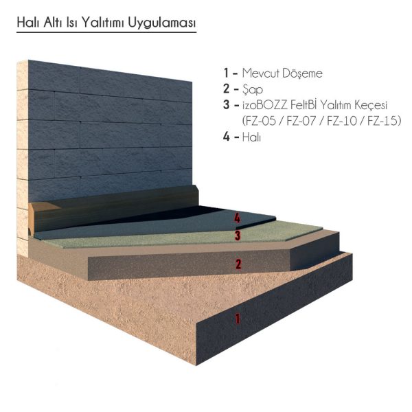 Halı altı ısı yalıtımı özellikle bodrum katlarda ve ısıtılmayan döşemelerde, konsol çıkmalarda sadece halı yeterli olmaz. Döşemeden soğuk gelen noktalarda halı altında halı gibi olan izoBOZZ FeltBi keçeler ısı yalıtım amaçlı kullanılır. Yoğuşmaya sebep olmadığı için koku yapmaz. Çürümez, bozulmaz. Yalıtım bir kere yapılır.